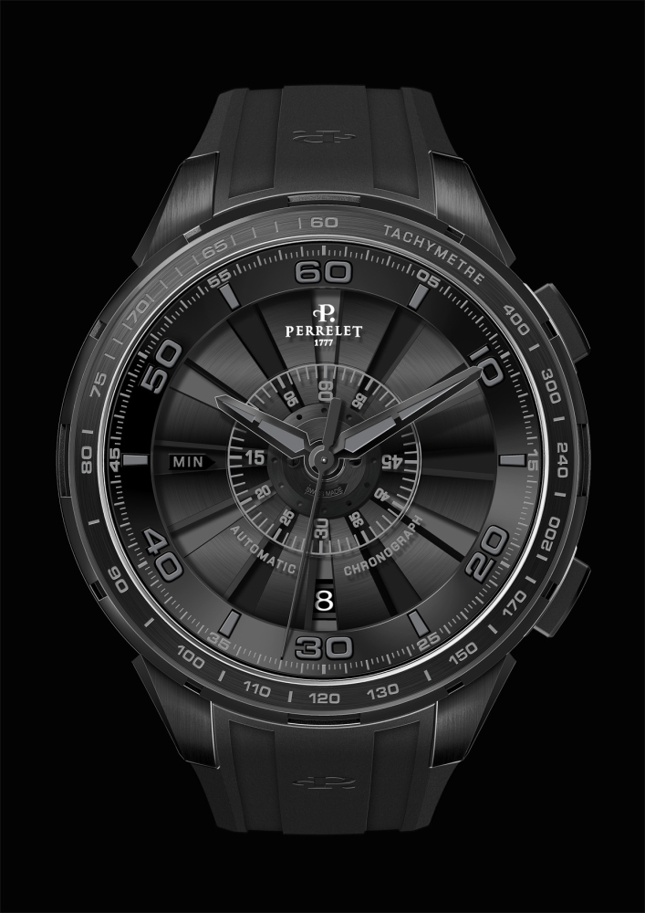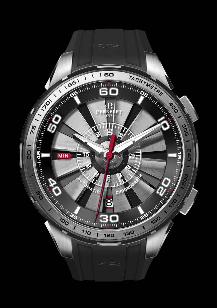 С 2009 года визитной карточкой старейшей швейцарской часовой марки «Perrelet» является коллекция «Turbine». Часы этой коллекции выделяются тем, что на циферблатах помещены двенадцать лопастей, напоминающих турбину, укреплённую на одной оси с ротором во время работы которого создаётся эффект вращающейся турбины выполняющей, по сути, декоративную функцию. Развивая эту новацию компания «Perrelet S.A.» выпустила множество дизайнерских версий «турбины», каждая из которых усиливала впечатление неповторимости этой инженерно-эстетической разработки. Так, например, были созданы часы, оснащённые светящимся циферблатом с вращающимися в завораживающем вихре лопастями. Кроме того, получила распространение версия для дайверов с турбиной в жёлто-синем оформлении, а также необычная версия часов с бриллиантовым черепом, который становился видимым при высокой скорости вращения «турбины». Безусловно, все эти модели, разные по своему дизайну и цветовому решению, в техническом плане были одинаковыми. И вот, через четыре года, компания «Perrelet S.A.» представила общественности принципиально новую разработку – хронограф «Turbine Chrono». Эти часы не только расширили популярную коллекцию «Turbine», но и ещё раз подтвердили высочайший уровень инженерно-технического потенциала компании.