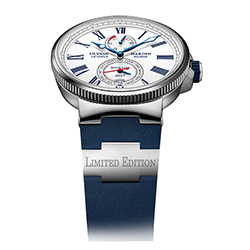 Римские цифры на белом циферблате, покрытом лаком, – узнаваемая деталь коллекции Marine. Как и положено истинно «морской» модели, водонепроницаемость Marine Chronometer Annual Calendar Monaco составляет 100 метров. Корпус диаметром 43 мм выполнен из нержавеющей стали. Часы имеют рифленый безель, фиксируемую на резьбе заводную головку с покрытием из каучука, механизм годового календаря с автоподзаводом, хронометр, подтвержденный сертификатом COS. Запас хода составляет 60 часов. За работой механизма можно наблюдать через прозрачную заднюю крышку, выполненную из сапфирового стекла с антибликовым покрытием. Завершает образ каучуковый ремешок с раскладывающейся застежкой для максимальной фиксации на запястье.
