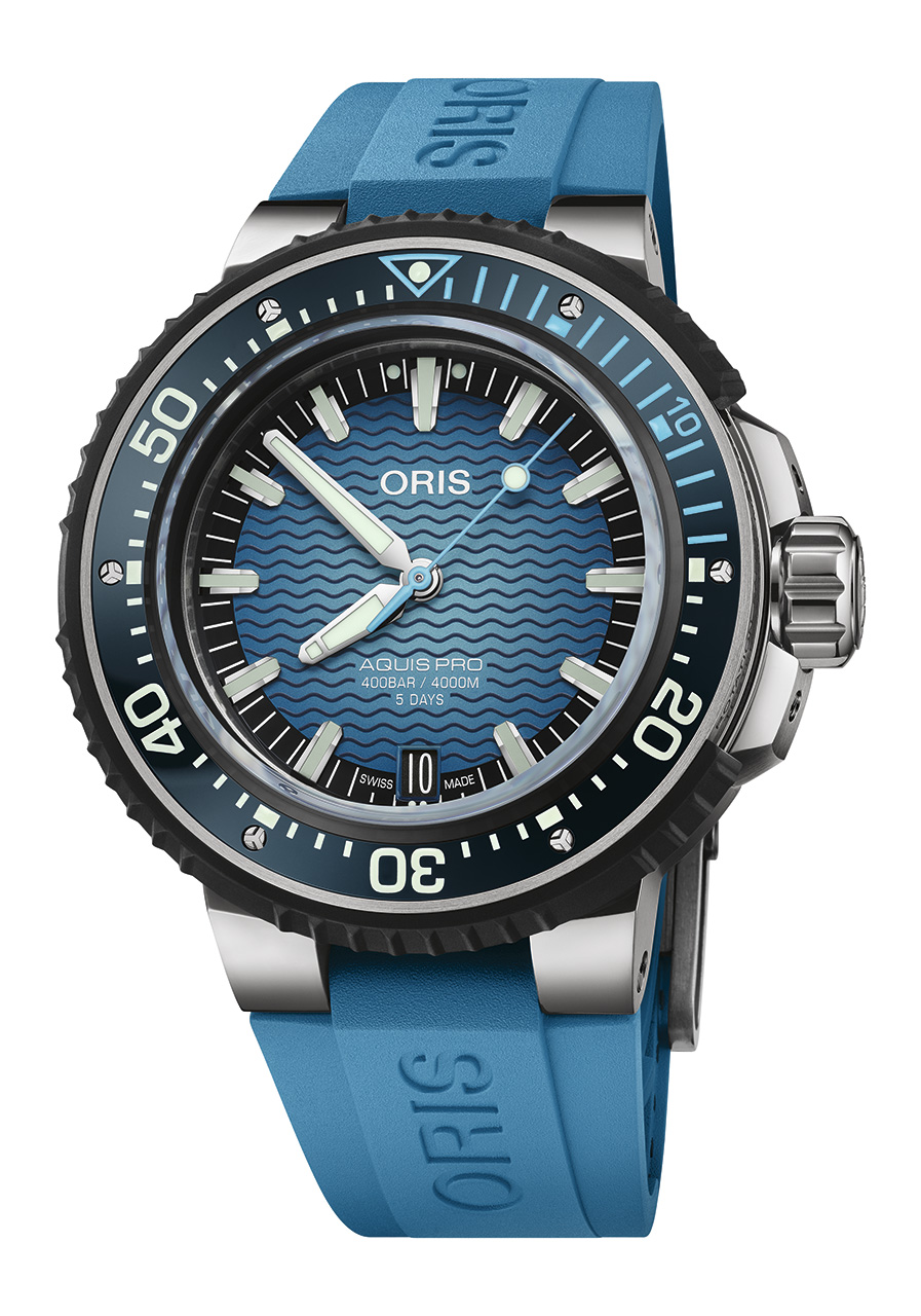 Oris создали AquisPro 4000m, самые водонепроницаемые часы для дайверов из когда-либо созданных, с титановым корпусом, способным выдерживать давление до 400 бар (что эквивалентно 4000 бар).метров глубины. Модель оснащена запатентованной технологией Oris, включая систему безопасности вращения. В часах предусмотрена система удлинения складной застежки безопасности, это означает, что ремень можно легко регулировать по длине пока часы носят.