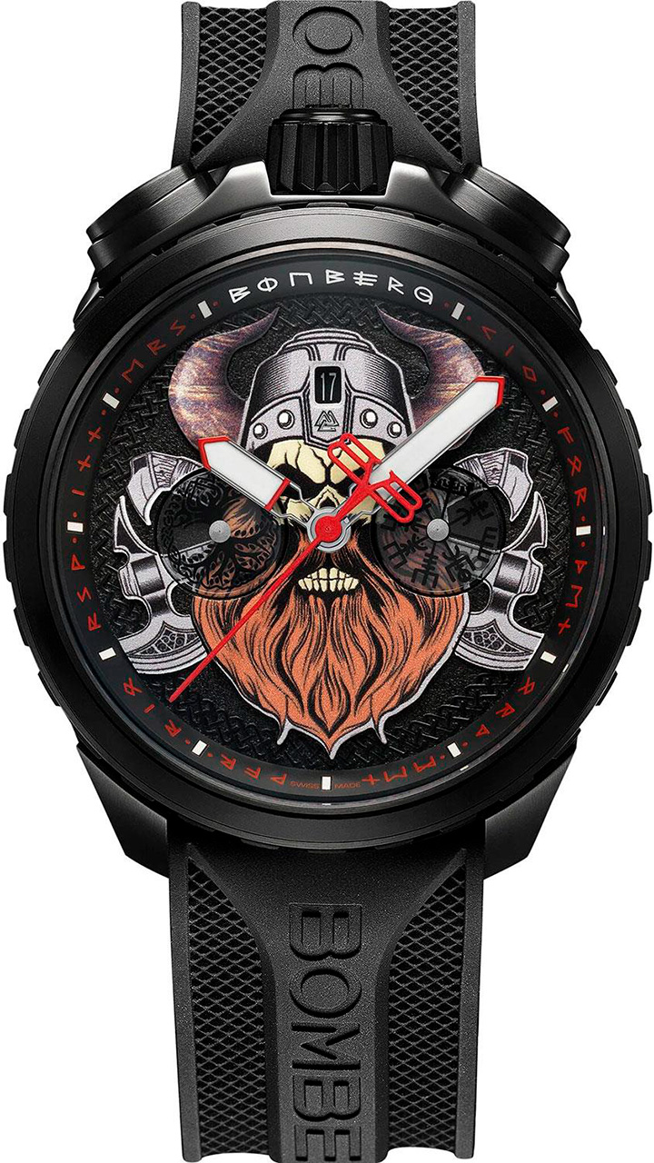 Стильные часы придутся по вкусу уверенным личностям готовым с легкость заявить о себе и ярко продемонстрировать неординарность характера. Bolt-68 Heritage Viking. Часы-трансформер с хронографом и секундомером. Секундомер с точностью 1/10с. Массивные заводная головка и кнопки управления хронографом находятся в верхней части корпуса. Циферблат декорирован изображением викинга (свирепый и отважный мужчина пришедший из Скандинавии) и эмблемами и значками из скандинавской мифологии. Циферблаты хронографа выполнены в виде важнейших символов викингов Иггдрасиль (древо жизни) и Вегвисир (северный компас). Борода викинга украшена люминесцентным составом. Мечевидные стрелки с люминесцентным покрытием.