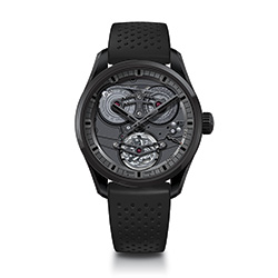 Полностью скелетонированный циферблат позволяет пристально рассмотреть оригинальную архитектуру механизма «El Primero 4805», имеющего сатинированные платину и мосты с пескоструйной обработкой и тёмно-серым покрытием, скошенными краями и полированными винтами, а также два традиционных мануфактурных усложнения. К ним, как уже было сказано, относятся – минутный турбийон, установленный чуть выше отметки «6 часов», и фузейно-цепная передача (спиралевидный конус фузеи, цепь и заводной барабан), помещённая в пространстве между отметками «10 часов 30 минут» и «1 час 30 минут». Сам циферблат представлен центральными прямоугольными частично скелетонированными фацетированными4 стрелками часов и минут с рутениевой5 отделкой и чёрным люминесцентным покрытием «Superluminova», а также вынесенными на фланец условными часовыми чёрными люминесцирующими индексами. Кроме того, в структуру циферблата входит стрелочный индикатор 50-часового запаса хода, расположенный напротив отметки «4 часа», шкала которого, с индексами «High» и «Low», помещена на фланец между отметками «3 и 5 часов».